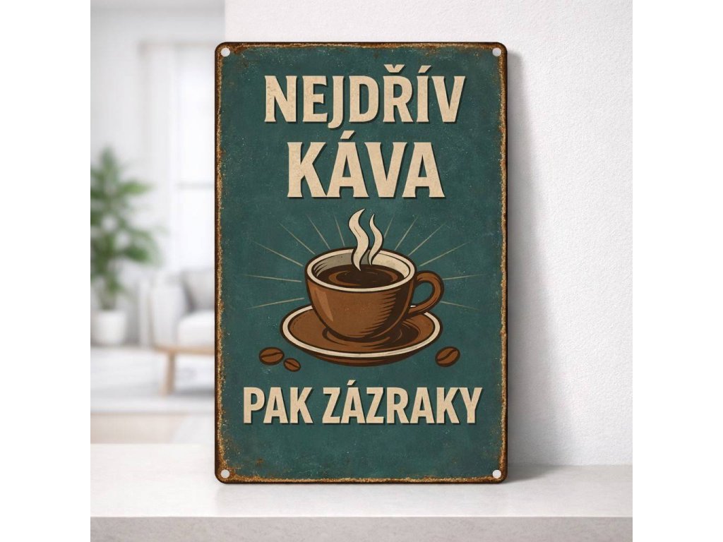 Ranní režim, který chápe každý kávomil. Tahle cedulka je malá připomínka toho nejdůležitějšího: nejdřív doplnit kofein — a pak teprve zachraňovat svět....