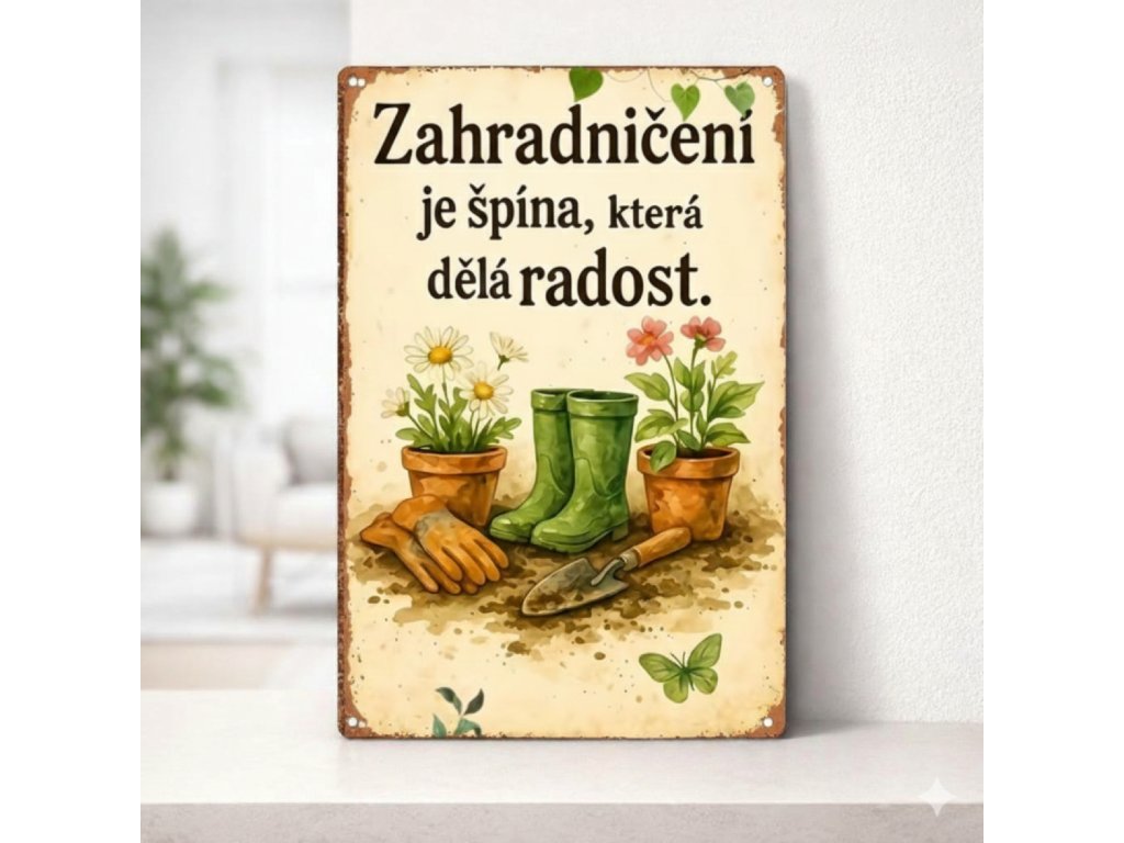 Text na cedulce: "ZAHRADNIČENÍ JE ŠPÍNA, KTERÁ DĚLÁ RADOST."