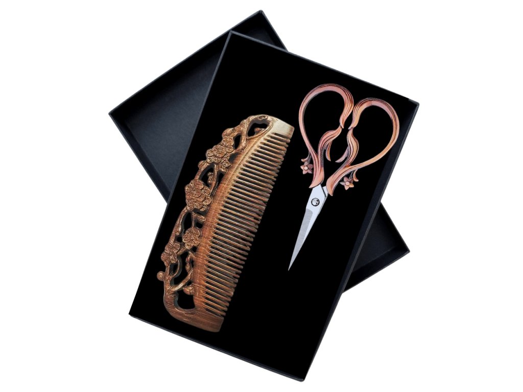 "Pokud milujete romantické kudrlinky a zdobení, pak vás tato sada uchvátí. Nádherný dřevěný hřeben a k tomu krásně ostré zdobené nůžky. To je prostě něco extra."