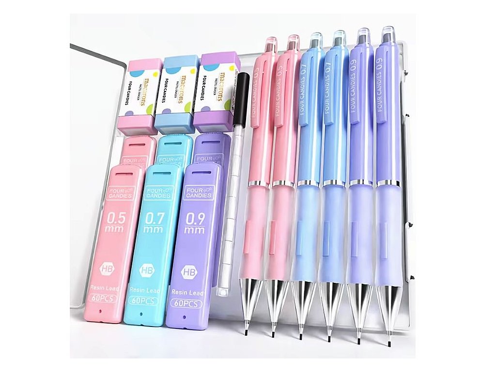 Vstupte do světa precizního kreslení a psaní s elegantní sadou mechanických tužek FOUR CANDIES PASTEL. Tato komplexní sada potěší zejména dívky, které si chtějí užít kreslení a rýsování s pomůckami, které mají originální design.