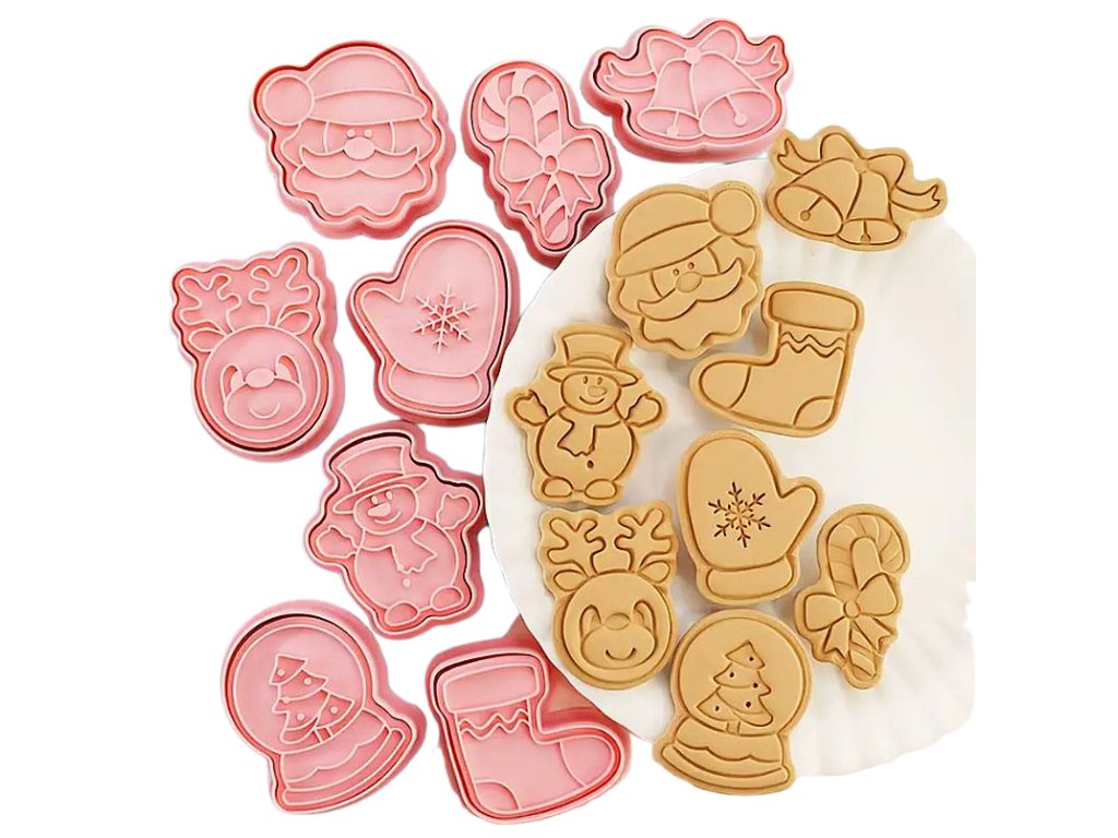 8× vykrajovátko (zvonečky - rukavice - sněhulák - Santa - hůlka - sob - koule se stromečkem - ponožka)